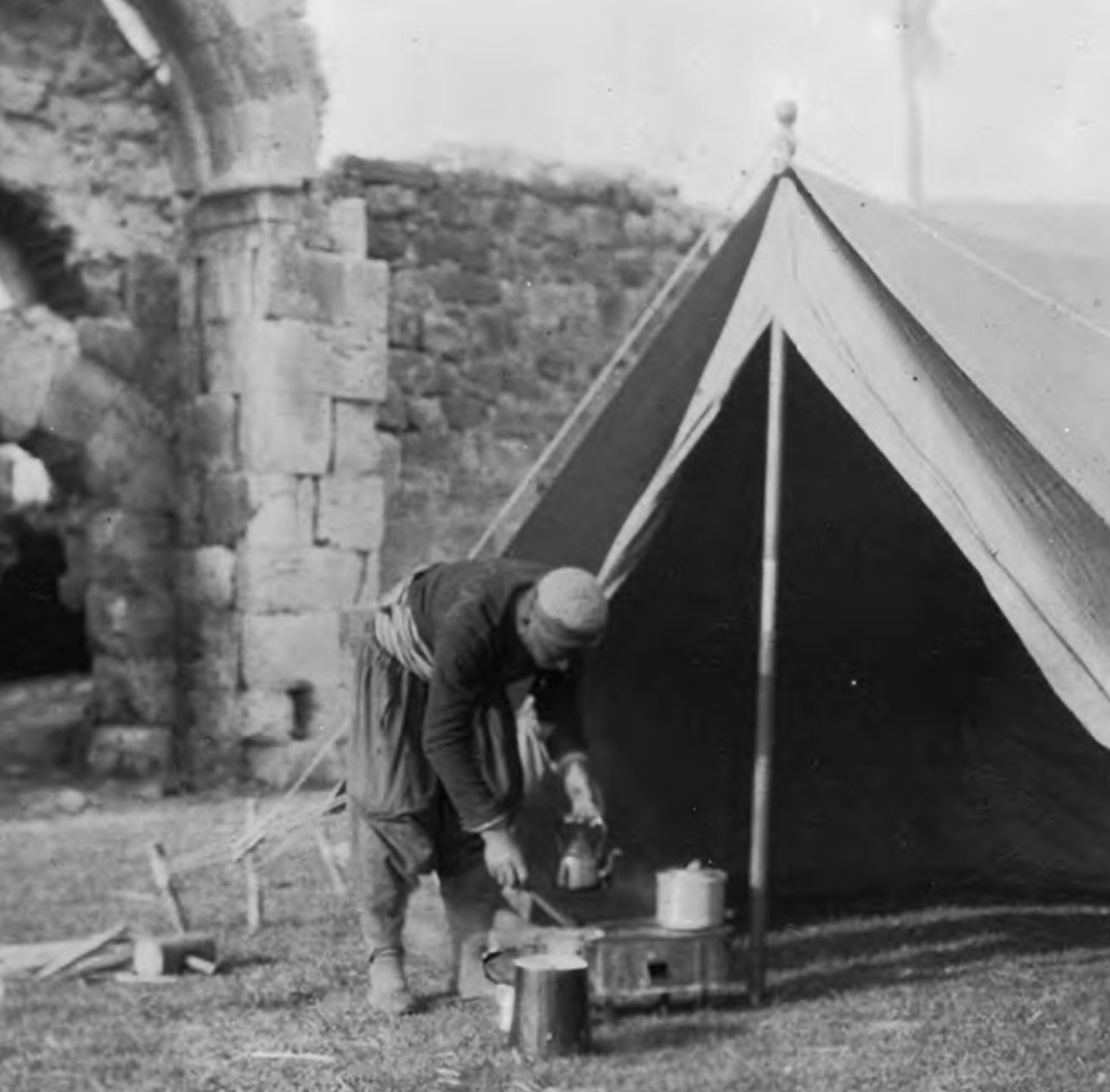 Bell’in Eğirdir Gölü yakınlarındaki kamp çadırı önünde çay demleyen Fattuh, Nisan 1907, Newcastle University, Gertrude Bell Archive, https://gertrudebell.ncl.ac.uk/p/gb-3-1-6-1-254, 07.10.23.