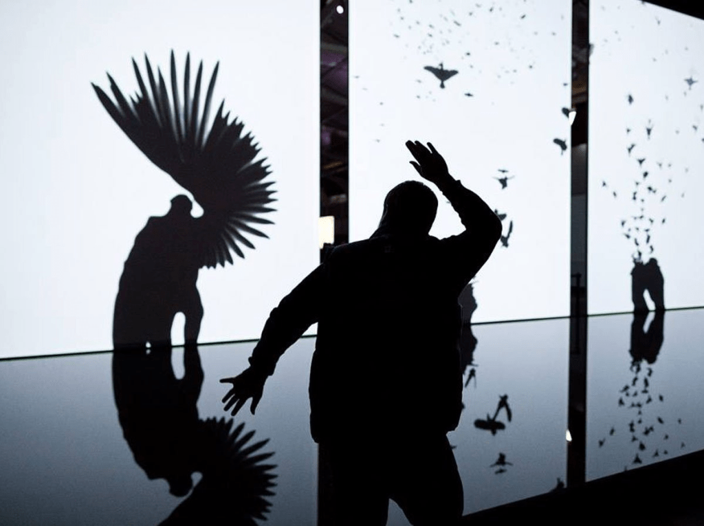 Bu üç bölümlü interaktif enstalasyon, insan figürlerinin büyük beyaz ekranlarda hareket ederek kuşlara dönüştüğü, izleyicilerin kendi gölgeleriyle etkileşime geçebildiği bir çalışma. Hareket algılayıcılar, projeksiyon sistemleri ve bilgisayar yazılımları kullanılarak izleyicilerin beden hareketleriyle etkileşim kurmaları sağlanarak, sanat ve izleyici arasındaki sınırları bulanıklaştırır.